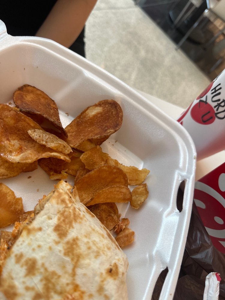Grilled chicken, cheddar Jack cheese, grilled peppers and onions w/ Chipotle sauce. Served w/Homemade Chips