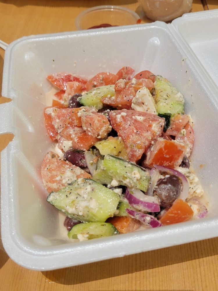 Cubed potatoes, fresh spinach, feta cheese, tomatoes and Kalamata olives.